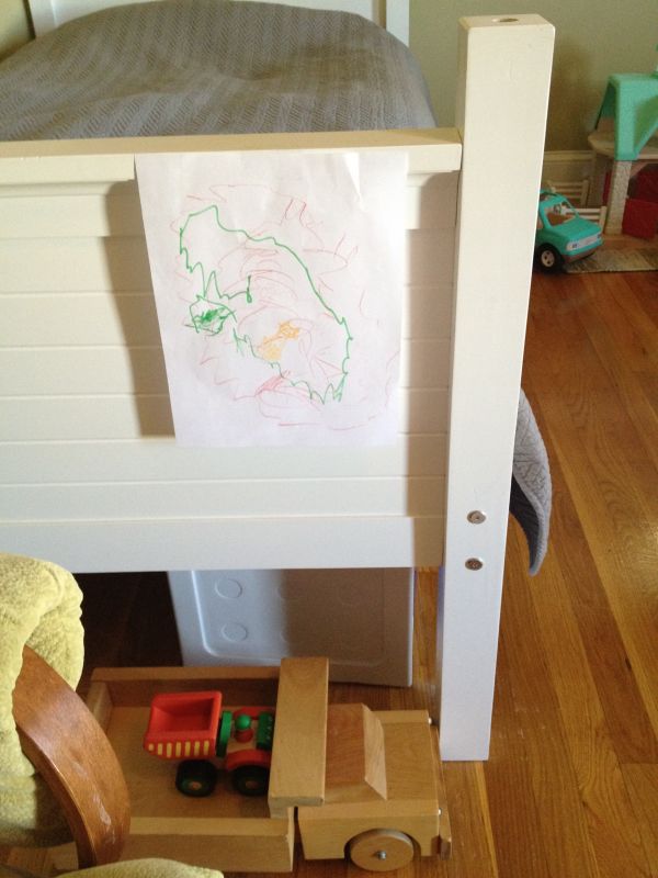 Альбом Jeremiah&Celeste. Фото "Это он написал "список Санте", чтобы ему подарили машины и грузовики:) Попросил ленту, приклеить на кровать. ДО всего этого додумался сам:) Наверное, под впечатлением мультфильмов:)" 58.8 k (600x800) IMG_9252.JPG