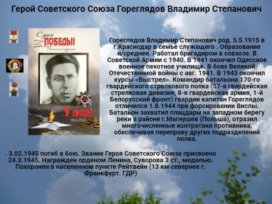 Гореглядов Владимир Степанович род. 5.5.1915 в г.Краснодар в семье служащего . Образование н/среднее. Работал бригадиром в совхозе. В Советской Армии с 1940. В 1941 окончил Одесское военное пехотное училище. В боях Великой Отечественной войны с авг. 1941. В 1943 окончил курсы «Выстрел». Командир батальона 170-го гвардейского стрелкового полка (57-я гвардейская стрелковая дивизия, 8-я гвардейская армия, 1-й Белорусский фронт) гвардии капитан Гореглядов отличился 1.8.1944 при форсировании Вислы. Батальон захватил плацдарм на западном берегу реки в районе г.Магнушев (Польша), отразил многочисленные контратаки противника, обеспечивая переправу других подразделений полка. 3.02.1945 погиб в бою. Звание Героя Советского Союза присвоено 24.3.1945. Награжден орденом Ленина, Суворова 3 ст., медалью. Похоронен в населенном пункте Рейтвейн (13 км севернее г. Франкфурт. ГДР) |