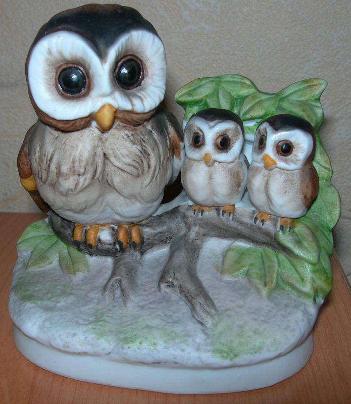 Owl & 2 Baby Owls Bisque Porcelain Figurine UCGC Korea