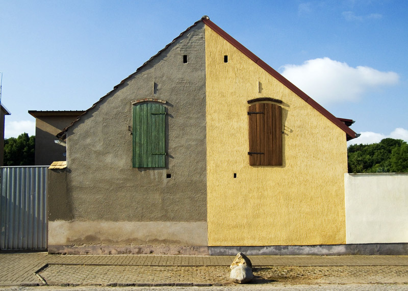 домик интересный, симметрия здесь имхо к месту (только слева чуть обрезать и подравнять по оси справа). надо мешок заменить на какого-нибудь бомжа, пионера с велосипедом и тп, причем именно в то же место :)