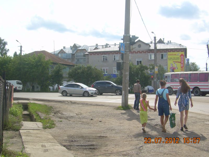 Кунгур, перекрёсток улиц Ленина и Гагарина, Поповы Василиса,Наталья и Екатерина. Здание Райпо и столовой,слева дом 49 по ул.Ленина.23 июля 2012 года